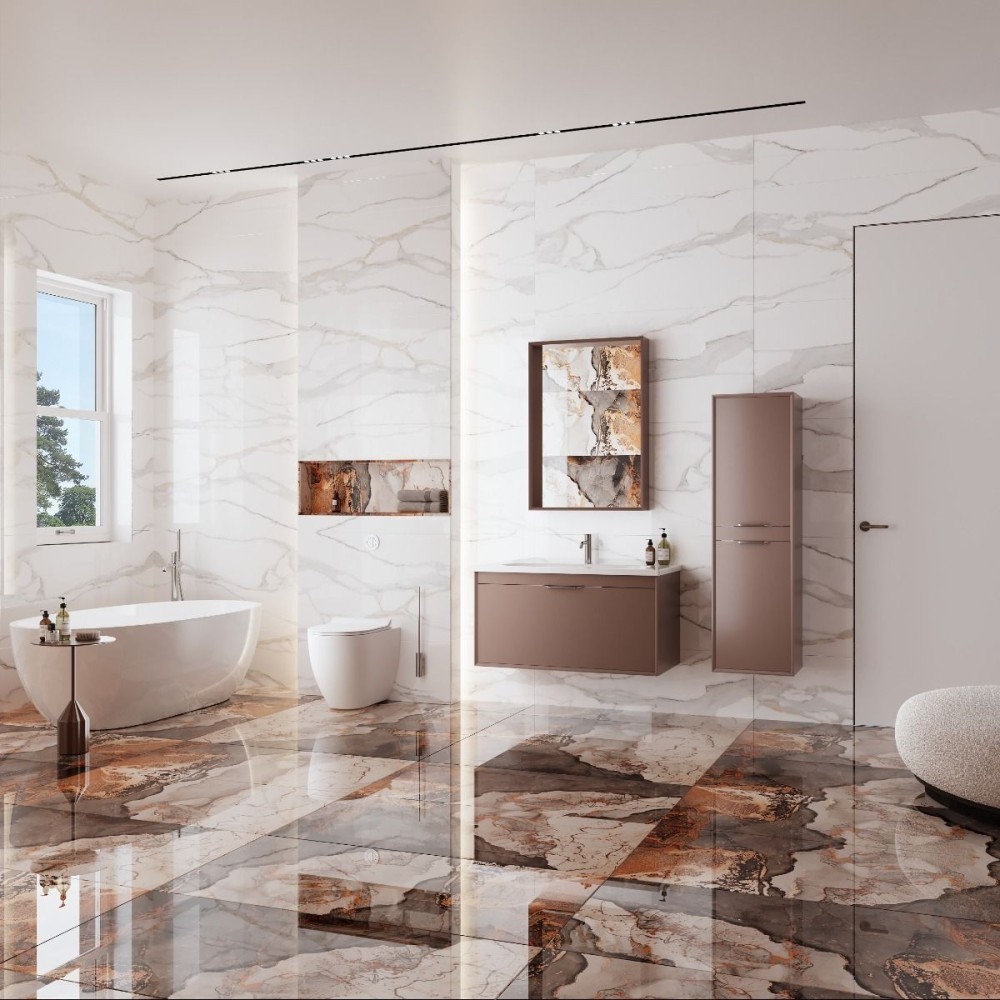 Gresie portelanata rectificata Calcutta (Calacutta) (Calcuta) Gold, 60x120 cm are aspect multisuprafete - modelul irizat, inspirat din estetica marmurei se extinde pe mai multe placi, oferid astfel un aspect unic in spatiul in care gresia este amplasata. Finisajul lucios adauga o nota eleganta si ofera un plus de luminozitate incaperii.